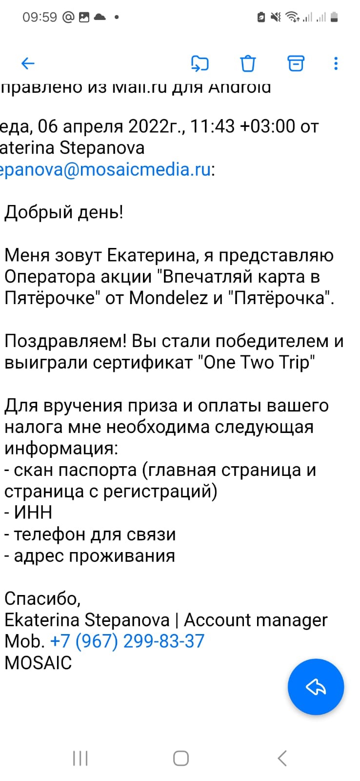 Электровнный сертификат "One Two Trip" номиналом 300 000 рублей от Акция Пятерочка и Milka, Alpen Gold, Oreo, Барни, Toblerone: «Впечатляй карта в Пятёрочке»
