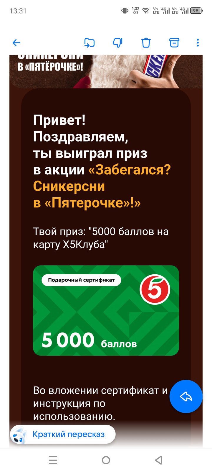 Приз акции Snickers «Забегался? Сникерсни в «Пятерочке»!»