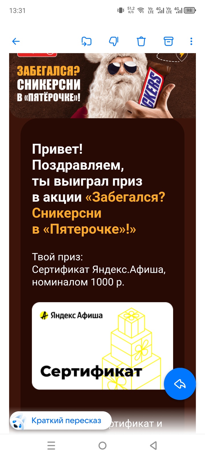 Призы / Лента призов / Mamama9 / Яндекс афиша от Snickers