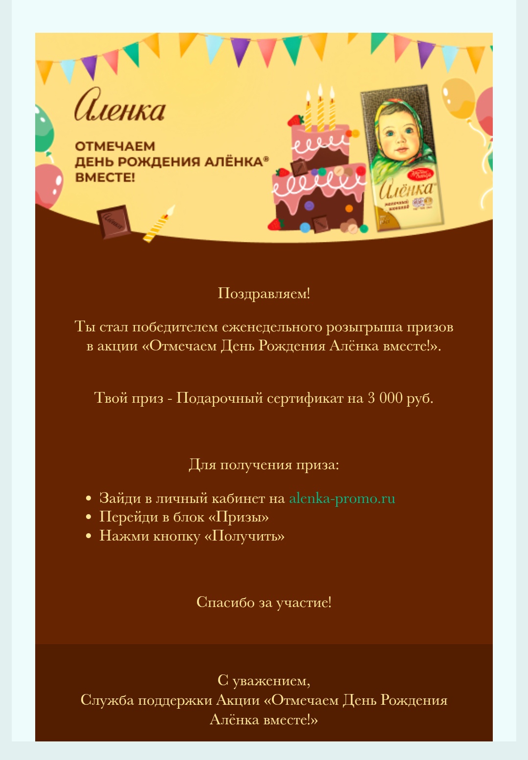 Приз акции Аленка «Отмечаем День Рождения Алёнка вместе!»