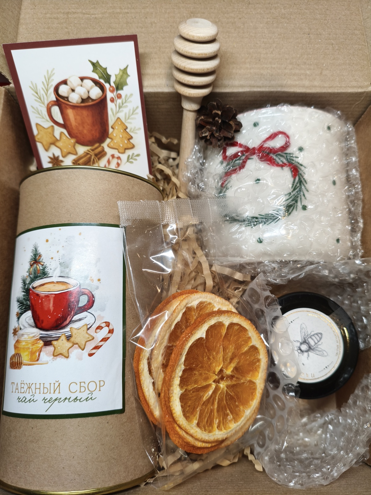 Вот таким красивым подарочном порадовали (кружка,мед ,чай,деревянная ложечка),сушёный апельсин)от Зевы🤗🎉!