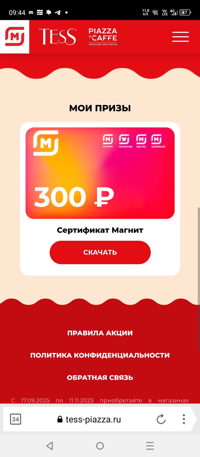 Tess Магнит «Исполняйте мечту c Tess и Piazza Del Caffe» С 17 сентября по 11 ноября 2025 Акция завершилась все призы акции