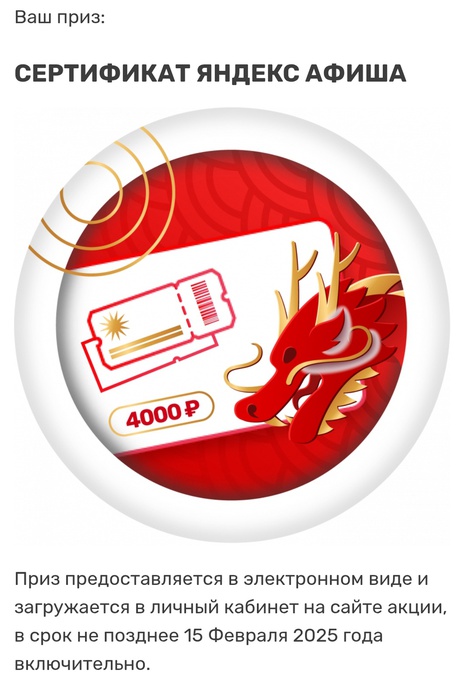 Призы / Лента призов / Norik / Яндекс Афиша на 4000₽ от Добрый