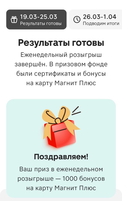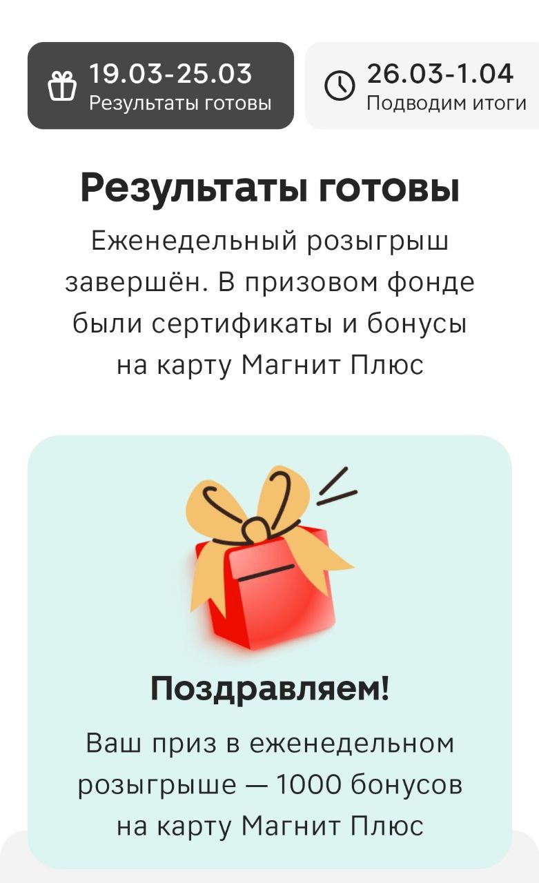 Светлана Заносиенко @Kalimahka, тоже 2 года участвую и ничего не выиграла ни разу , да и в целом в магните ни по чекам ни по автомату не выигрывается , поэтому предпочитаю туда ходить крайне редко )