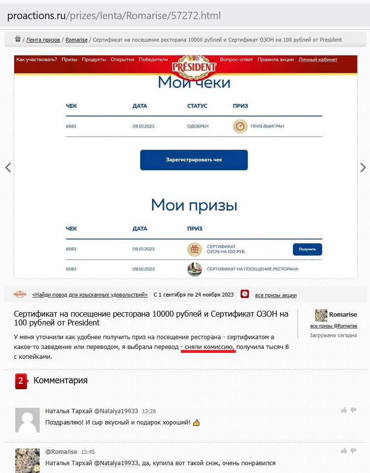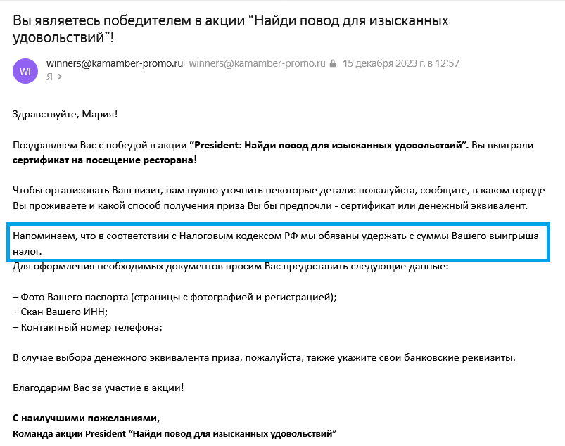 У меня уточнили как удобнее получить приз на посещение ресторана - сертификатом в какое-то заведение или переводом, я выбрала перевод - сняли налог, получила тысяч 8 с копейками.
