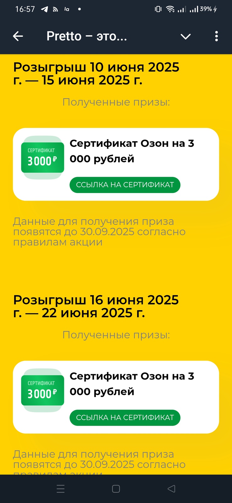 Призы / Лента призов / Swetik2512 / Сертификат Ozon на 3 000 руб от Pretto
