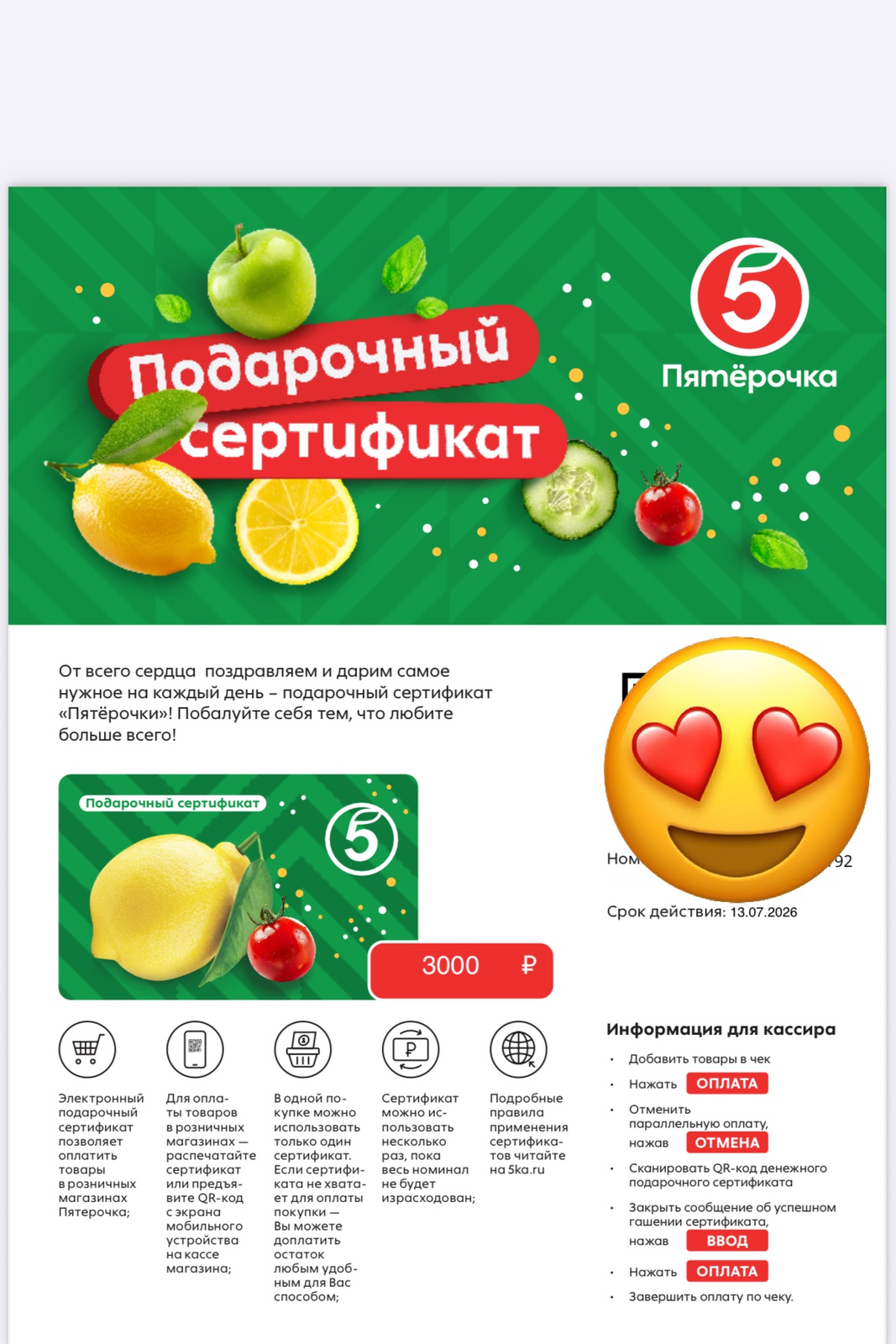 Сертификат на 3000₽ в магазин Пятерочка, за покупку мороженного Магнат. Зарегистрировала 4 чека и выиграла 🤗