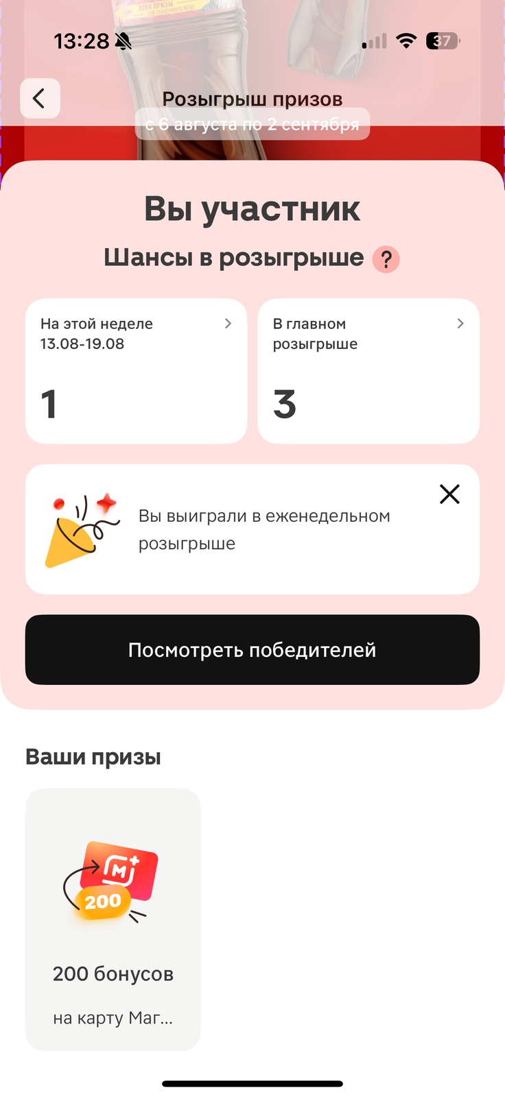 Призы / Лента призов / Valundra / 200 бонусов на карту Магнит Плюс от Черноголовка
