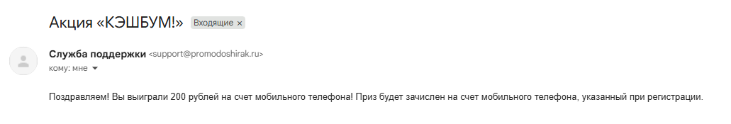 Призы / Лента призов / danuil2001 / Выиграл 200 рублей на счет мобильного телефона! от Доширак