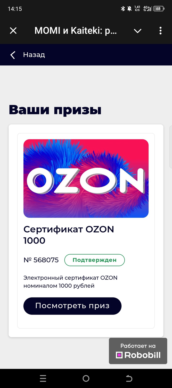 Приз акции Momi «MOMI и Kaiteki: Розыгрыш на миллион!»