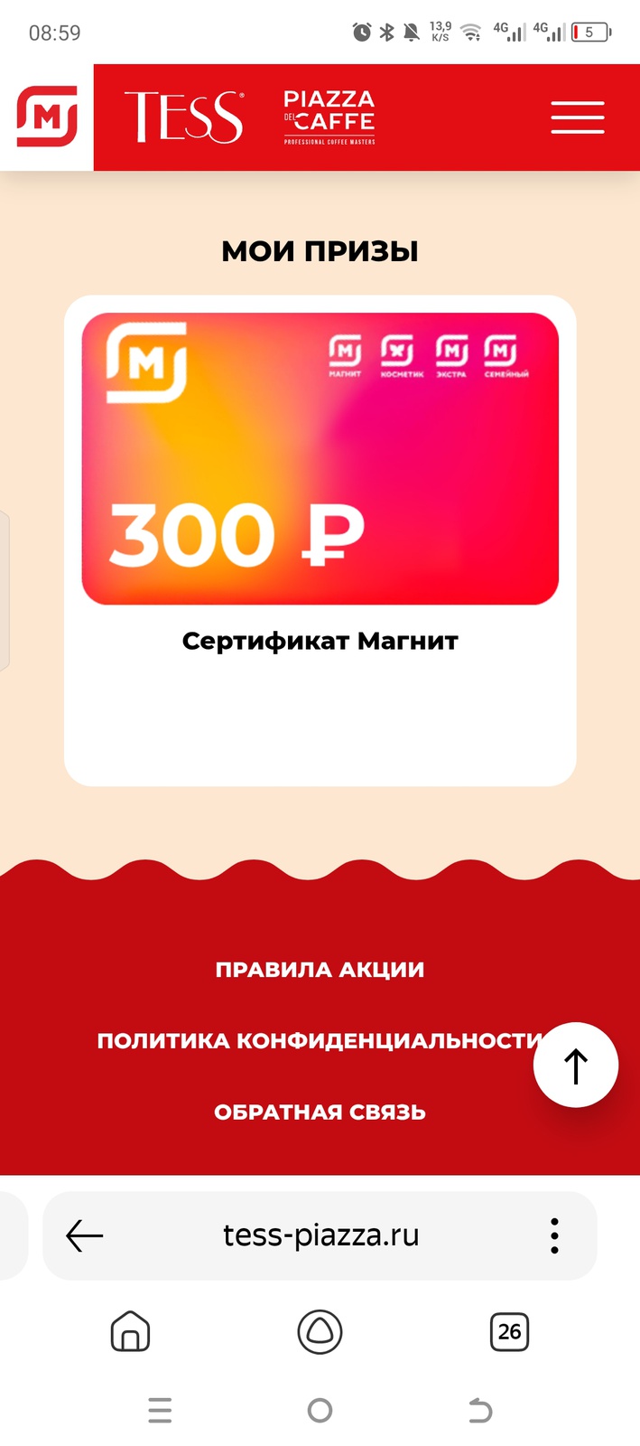 Tess Магнит «Исполняйте мечту c Tess и Piazza Del Caffe» С 17 сентября по 11 ноября 2025 Акция завершилась все призы акции