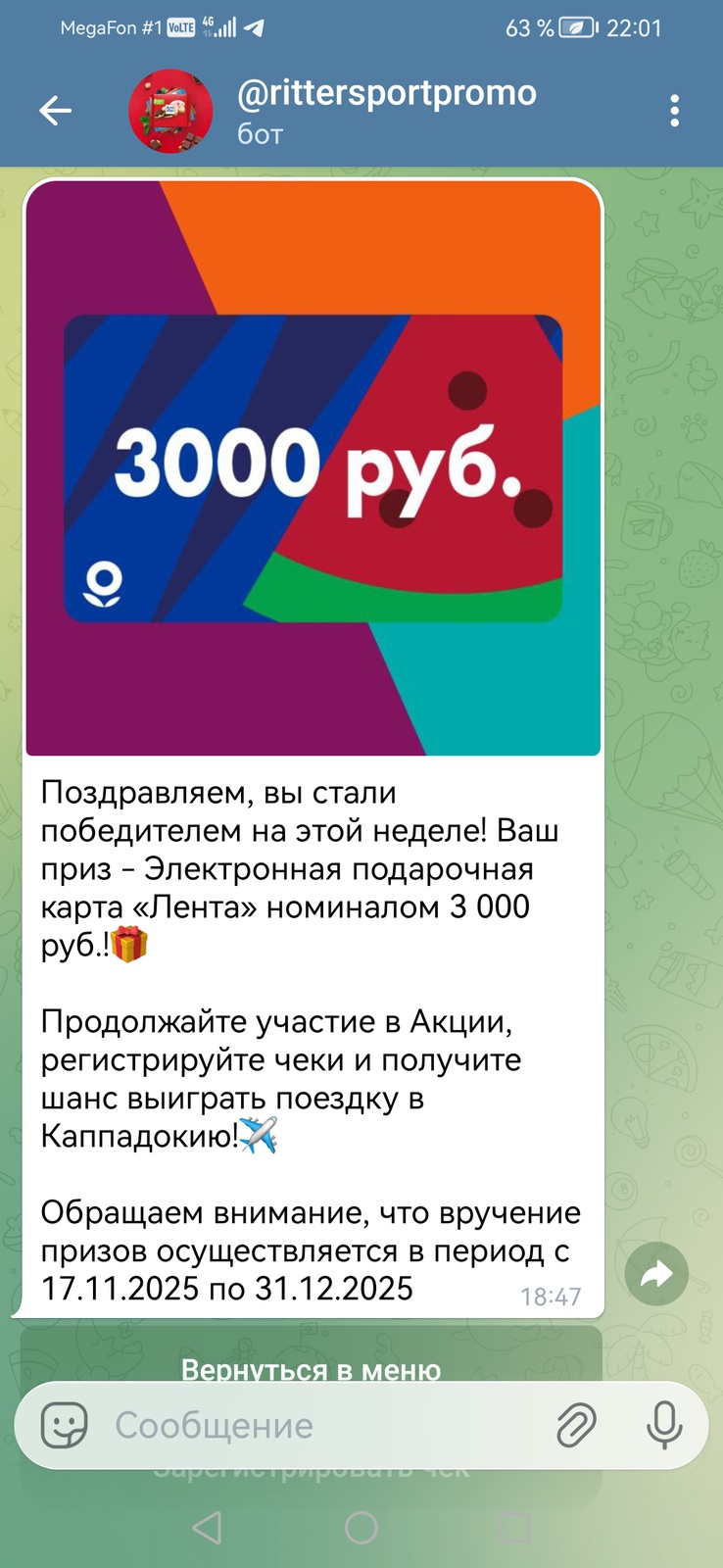 Приз акции Ritter Sport «Откройте мир ярких вкусов и призов в Ленте с Ritter Sport»