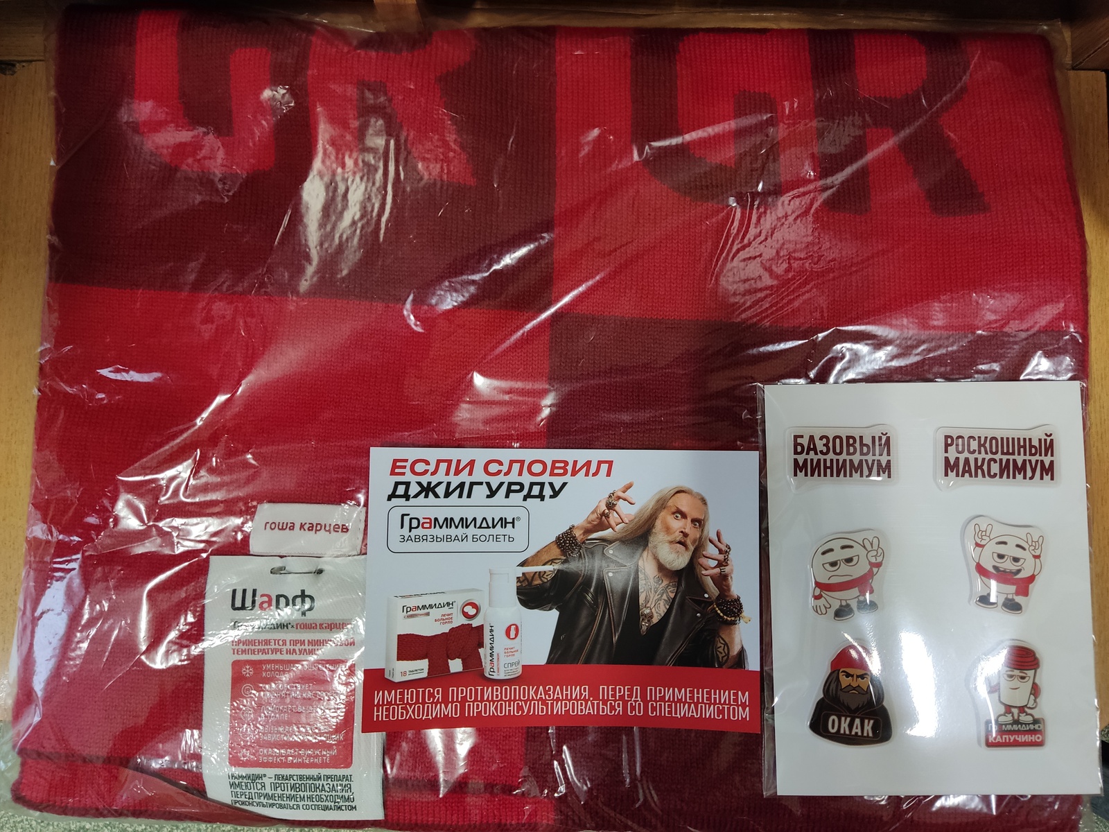 Привезли в большой коробке, упаковано и в бумагу и в путырку ещё, прям как могли) значки ещё какие то положили. Шарф большой, огромный просто. Мне понравился!