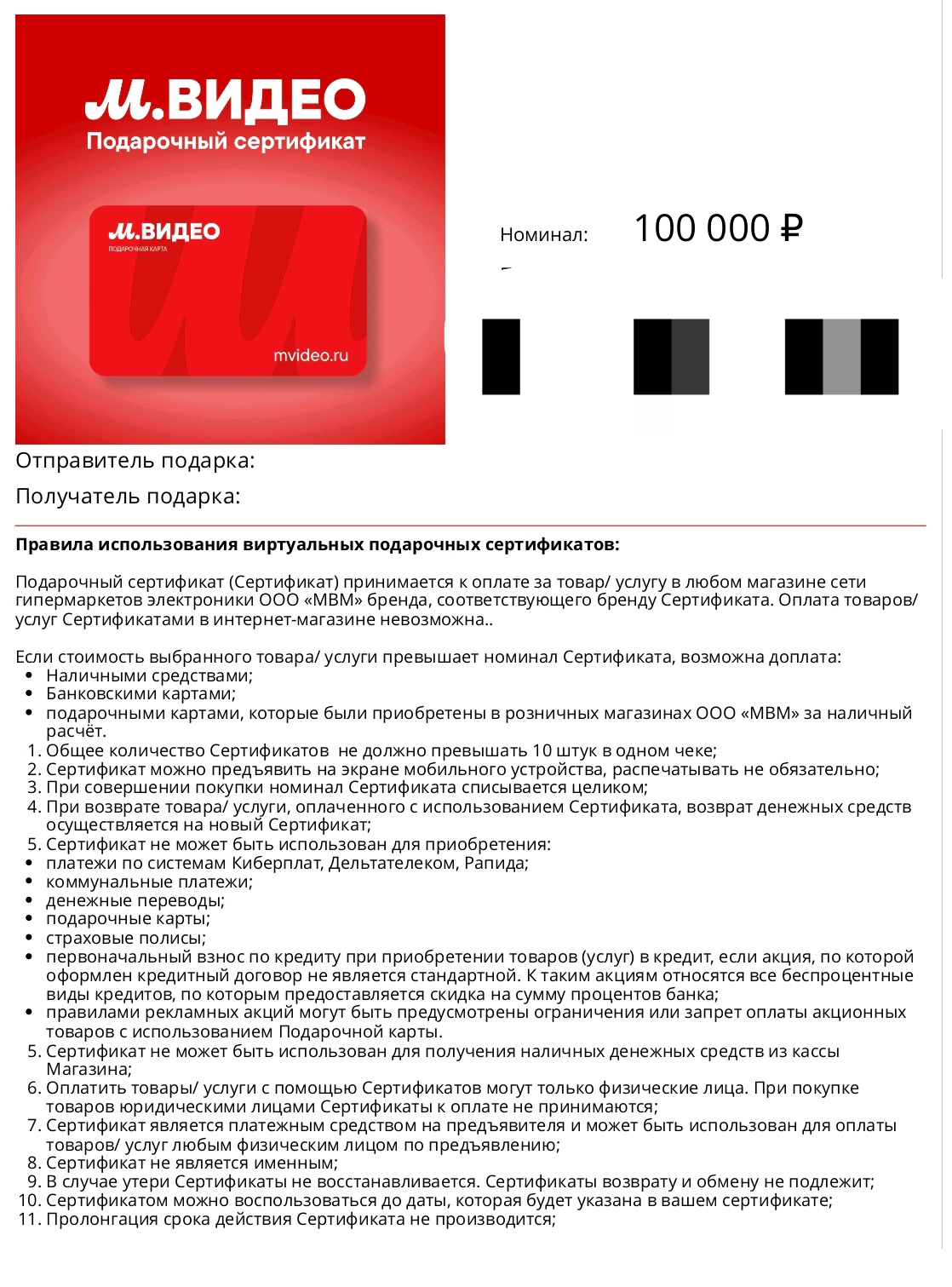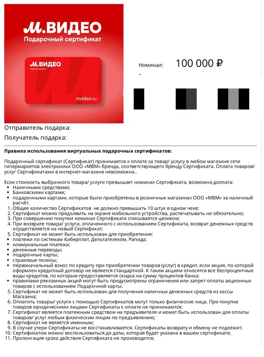 Сертификат М-видео 100000 рублей от Mr. Muscle