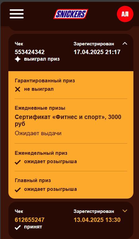 Snickers «Сникерсни, и ты снова – супер-ты 2.0» С 24 февраля по 18 мая 2025 Акция завершилась все призы акции